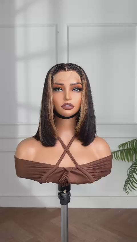 Upgrade your look with this 12-inch, 4x4 closure bob wig. Featuring a natural black base with bold golden blonde highlights at the front for a striking face-framing effect, this wig is designed to turn heads. The sleek, straight texture and blunt ends provide a polished and sophisticated appearance. The 4x4 lace closure ensures a natural-looking hairline, making it easy to achieve a flawless, seamless style.